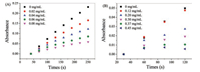 | Fig. 2. (A) The time-dependent absorbance changes at 325 nm of SOD activity detection system by improved Marklund method with the absence or presence of various concentrations of Mn-doped ZnS QDs. (B) The time-dependent absorbance changes at 550 nm of SOD activity detection system by McCord method with the absence or presence of various concentrations of Mn-doped ZnS QDs. | |