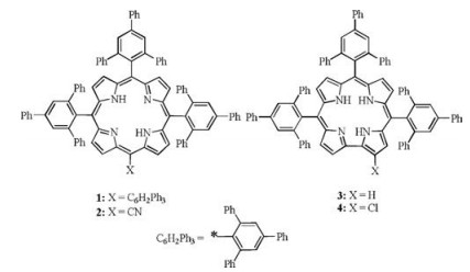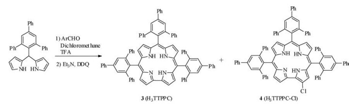 In 1983, Suslick reported for the first time the synthesis of bispocket 5,10,15,20-tetrakis(2,4,6-triphenylphenyl)-porphyrin 1 (H2TTPPP) in 1% yield by slow addition of a stoichiometric amount of pyrrole diluted in xylenes to a refluxing propionic acid solution of 2,4,6-triphenyl-benzaldehyde [39]. It can also be prepared by condensation of pyrrole and 2,4,6-triphenyl-benzaldehyde using 2,4,6-collidine as solvent at elevated temperature [40]. Lindsey [41, 42] and Drenth [43] independently observed that strong acid catalyzed condensation of pyrrole and aldehyde under inert atmosphere in chlorinated solvents (CH2Cl2 or CHCl3) may significantly improve the yield of porphyrins with bulky substituents at the ortho positions. Previously, we have observed that the trifluoroacetic acid (TFA) may intensely increase the yield of corrole 3 (H3TTPPC) [36] in the catalytic condensation of 2,4,6-triphenyl-benzaldehyde and its dipyrromethane. However, we found that the employment of TFA in the direct condensation of same aldehyde and pyrrole only afforded an A3B-type meso-cyano porphyrin 2 (H2TTPPPCN) with a yield of 4% [35], and no bis-pocket porphyrin 1 could be isolated. Is it possible to prepare bulky porphyrin 1 by TFA catalyzed condensation of 2,4,6-triphenylbenzaldehyde and its dipyrromethane? A careful investigation leads to current finding of a newlight green color 2-chloro-5,10,15-tris(2,4,6-triphenylphenyl)-corrole 4 (H3TTPPC-Cl) (Scheme 1).