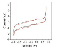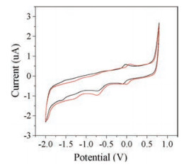 | Fig. 5. Cyclic voltammograms of corrole 3 (H3TTPPC) (black line) and 4 (H3TTPPC-Cl) (red line) (2.4 μmol/L) in 0.1 mol/L [n-Bu4N]ClO4 DMF solution at a glassy carbon electrode with the scan rate of 100 mV/s. | |