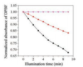 | Fig. 6. Plot of change in absorbance of DPBF (blue line) at 418 nm vs. irradiation time in the presence of 3 (H3TTPPC) (black line) and 4 (H3TTPPC-Cl) (red line) in DMF. | |
