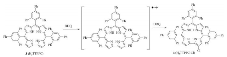 Recently, Nardis and coworker have reported the regioselective chlorination of 5,10,15-tritolylcorrole using DDQ as oxidant and hydrochloric acid as chlorination source through radical cation [29]. They had tested many haloacids and found that the halogenation regioselectivity depended on the size of halogen atom and steric hindrance produced by meso substituent. In our case, no haloacids was present in the reaction system. Thus, the chloride in 4 might come from DDQ. A possible mechanism for the formation of mono chlorinated bulky bis-pocket corrole 4 was depicted in Scheme 3. In which the DDQ caused the oxidation of corrole to produce radical cation intermediate, followed by the substitution of hydrogen by chloride atom from DDQ. Steric crowding provided by the bulky groups at meso positions may facilitate the chlorination on position 2. The support of this mechanism comes from the recent observation of ortho-chlorination of 2-arylpyridines by DDQ [44]. The other possible way is that the chloride comes from chlorinated solvent, dichloromethane. Detailed mechanism of this reaction still needs further investigation. Halogen substituted corrole is considered as one of the most efficient precursor that can be further modified through Pdcatalyzed cross-coupling reactions, such as the Suzuki, Heck, Sonogashira, Stille, Negishi or Kumada procedures, where the Chalogen bond can be easily replaced with a stable C—C bond, and this approach has been well maneuvered for the preparation of undecaryl-corroles [45], tetrabenzo-corroles [46-49] and alkynylcorroles [50]. Our case finding in the preparation of selective chlorinated corrole may have practical uses in the synthesis of more sophisticated corrole architectures, having specific features for versatile applications.