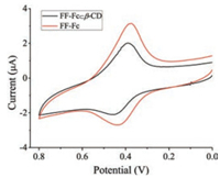 The electrochemical behaviors of Fc-FF in the absence and presence of β-CD were also investigated by cyclic voltammetry. The typical cyclic voltammetry (CV) curves for Fc-FF before and after complexation with β-CD are depicted in Fig. 2. The addition of equimolar β-CD into Fc-FF solution could cause a positive shift of half-wave potential and a decrease in the peak current. These phenomena demonstrate that Fc-FF becomes more difficult to be oxidized, reflecting the stabilization effect originated from the protection of β-CD toward ferrocene in aqueous media.