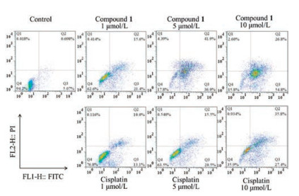 In order to evaluate whether compound 1 could induce apoptosis like cisplatin does, we then conducted an Annexin-V/ PI binding assay. HepG2 cells were treated with 1 for 72 h at different concentrations, with cisplatin as a positive control. As shown in Fig. 6, a few (5.77%) apoptotic cells were present in the negative control group (DMSO). The apoptosis population rose to 37.0%, 77.9% and 81.6% after treatment with 1 at 1 μmol/L, 5 μmol/L and 10 μmol/L, respectively. However, cisplatin only induced 23.1%, 36.0% and 63.2% apoptosis populations at 1 μmol/L, 5 μmol/L and 10 μmol/L, respectively. It meant 1 is a more potent proapoptotic agent than cisplatin.