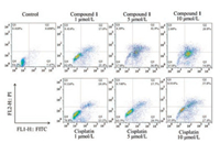 | Fig. 6. Representative flow cytometric diagrams of apoptotic HepG2 cells after 72 h treatment with cisplatin and 1. Q1 represents the necrotic or damaged dead cells, Q2 represents apoptosis cells in later stage, Q3 represents apoptosis cells in early stage, and Q4 represents live cells | |