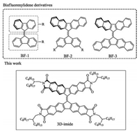 In recent years, bifluoreylidene and its derivatives have attracted great attention, since their unique conformational behavior [1, 2] and they are promising as new generation of electron acceptors in organic electronics [3-6]. Nowadays, the structures of related molecules are limited, which can mainly be divided into three types, namely, BF-1 [7-13], BF-2 [3, 14-15] and BF-3 [3, 14, 16] (Fig. 1). As for compounds BF-1 with functional groups in different positions, they present various conformations and physicochemical properties. For instance, the dihedral angle between two fluorene π-planes is range from 31° to 52° [12]. For compounds BF-2 and BF-3 [3], due to the effect of the enhanced π-conjugation, their absorption onsets of UV–vis spectra can be shifted to long wavelengths of 560 nm and 603 nm, respectively, which is beneficial to harvest more sunlight. Even though BF-2 based organic photovoltaics devices realized a power conversion efficiency (PCE) of 1.7% [3], its narrow light absorption range and high lowest unoccupied molecular orbital (LUMO) level strongly restrict further device efficiency improvement.