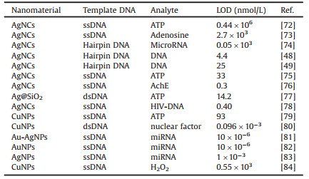 4.2. Application to biological analysisDNA mediated metal nanomaterials usually have good biocompatibility, low toxicity and easy modification, so they have been widely used as sensitive and selective probes or sensors for the rapid analysis of small biomolecules, protein, nucleic acid, etc. And the principles of DNA-mediated metal nanomaterials for biological analysis are showed in Fig. 3. Some typical works in recent years have been summarized in Table 1 [72-74, 48, 49, 75-84].