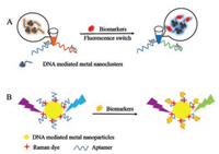 | Fig. 3. Schematic illustration of principles of DNA-mediated metal nanomaterials for biological analysis: (A) fluorescence method, (B) SERS method. | |