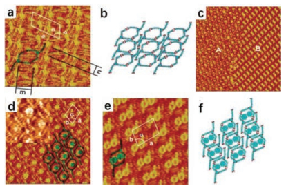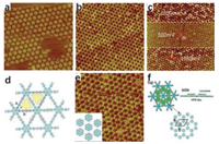 | Fig. 8. (a) High-resolution STM images of the snowflake-like structures. (b) Highresolution STM images of the honeycomb structure. (c) High-resolution image of HPB—COR co-adsorption assembly. (d), (e), (f) Supposed molecular model of (a), (b), (c). Reproduced with permission [60]. Copyright 2016, American Chemical Society. | |