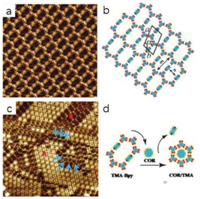 | Fig. 10. (a) A STM image of the binary assembly structure. (b) Suggested molecular model of Bpy/TMA binary assembly. (c) A STM image of COR/TMA and TMA/Bpy assembly structures. (d) Schematic diagram for this competitive adsorption process. Reproduced with permission [63]. Copyright 2014, The Royal Society of Chemistry. | |