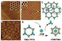 | Fig. 11. (a) STM image of an ordered hexagonal network of TPTZ at 1-heptanoic acid/HOPG interface. (b) STM image of TPTZ/TMA network structure. (c) Suggested molecular model of TPTZ/TMA binary assembly. (d) The COR/TMA host-guest structure reconstruction when COR molecules were added intoTMA-TPTZ assembly system. (e) Schematic diagram for this dynamic layer reconstruction. Reproduced with permission [63]. Copyright 2014, the Royal Society of Chemistry. | |
