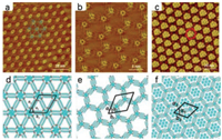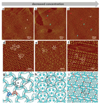 | Fig. 2. Self-assembled structural transition with decreases of solvent concentration: (a) STM image of the StOF-disorder structure (undiluted). (b) STM image of the coexistence of disordered and well-ordered structure (5× dilution). (c) STM image of the StOF-honeycomb structure (5 × 5 dilution). (d) High-resolution image of StOF-honeycomb structure after heating. (e) High-resolution STM image of COR/StOF-honeycomb self-assembly after heating. (f) High-resolution STM image of COR/StOF–honeycomb self-assembly after heating. (g), (h), (i) supposed model based on (d), (e), (f), respectively. Reproduced with permission [41]. Copyright 2016, American Chemical Society. | |