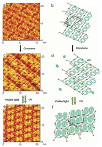 4NN-macrocyclic is well-designed macrocyclic compounds consisting of four diazobenzene photosensitive units which can process reversible cis-trans isomerization and cause drastic changes in structures and chemical properties. Thus, 4NNmacrocycle has unique photoisomerization properties because of the four photosensitive diazobenzene groups without alkyl chains. 4NN-macrocycle cannot be observed on surface solely under the STM investigation but can be stabilized in the TCDB network with its thermally stable trans-trans-trans-trans (t, t, t, t) state at heptanoic acid/HOPG interface, which can form wellordered 2D networks with flexible nanoscale pores through hydrogen bond (Fig. 3a). With the TCDB/4NN-macrocycle mixing ratio differ, two kinds of TCDB/4NN-macrocycle self-assembling structures were observed at heptanoic acid/HOPG interface before light irradiation, including (t, t, t, t) 1 and (t, t, t, t) 2. When the 4NNmacrocycle/TCDB co-assembled network was irradiated by UV light, it was observed to undergo hotoisomerization from the two former structures to three (t, t, t, t) photoisomers, three (t, t, t, c) photoisomers, and one (t, c, t, c) photoisomer, which provides a facile approach to study photoisomerization process of the azobenzene derivatives and the conformation of their photo-isomers in ambient environment [42]. It should be concluded that the photoisomers are also observed to appreciably affect the guest-host network characteristics during the photocycled switch process [43]. Prior to irradiation, 4NN-macrocycles in the TCDB/4NN-macrocyclic/COR system adopts (t, t, t, t) photoisomer, COR is absorbed on the 4NN-macrocycle (Fig. 3c). When ternary structure is irradiated with ultraviolet light, the 4NN-macrocycle adopts the (t, c, t, c) photoisomer, and its inner cavity is deformed so that the COR molecule is trapped in the ellipse of the 4NN-macrocyclic isomer (Fig. 3e). On the other hand, the approximate system energy indicates that the transition between (t, t, t, t) and (t, c, t, c) photoisomer can occur easily when the sample is irradiated with ultraviolet light and visible light. It is worth noting that there is a choice of isomers in the self-assembly process, and the surface network will affect the kinetic process of the isomerization of the 4NN-macrocycles. Such photoisomerization-dependent guest immobilization has also been observed for the adsorption of dicarboxyazobenzene substituted DBA. After irradiation of the surface, the number of cavities contains more than two COR molecules increased [44].
