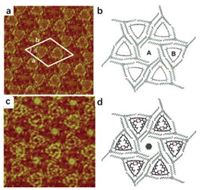 | Fig. 4. (a) A high-resolution STM image of the TCDB/3 N N macrocycle hybrid networks (21 nm × 21 nm). (b) Tentative network model of the hybrid networks. (c) A four components architecture STM image of a mixture of TCDB, 3 N Nmacrocycle, coronene and heptanoic acid solvent molecules (16.4 nm × 16.4 nm). (d) Tentative network model showing the four component networks. Reproduced with permission [49]. Copyright 2013, The Royal Society of Chemistry. | |