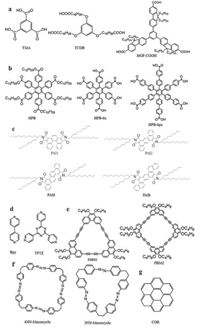 | Scheme 1. Chemical structures of the adsorbate molecules: (a) molecules with three carboxylic groups (TMA, TCDB and StOF—COOH3). (b) HPB and HPB derivatives HPB-6a, HPB-6pa. (c) polycyclic aromatic diimide derivatives PAI1, PAI2, PAI6, PAI8. (d)4, 4'-bipyridine (Bpy) and 1, 3, 5-tris(4-pyridyl)-2, 4, 6-triazine (TPTZ) (e) macrocycle formed by phenanthrene molecules: PBM1, PBM2. (f) macrocycles formed by diazobenzene groups: 4NN-macrocycles and 3 N N-macrocycles. (g) guest molecules: COR. | |