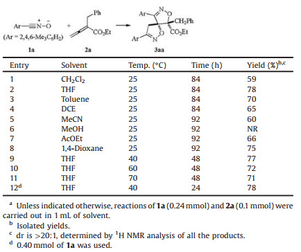 As a type of readily accessible 1,3-dipoles, nitrile oxides have extensively been utilized in various cycloaddition reactions [16]. Generally, nitrile oxides are unstable and thus are employed as reactive species produced in situ from the corresponding oxime halides in the presence of a base. Exceptionally, some nitrile oxides are stable and can be isolated. In our investigation, the stable nitrile oxide 1a was used (Table 1). Initially, the double [3 + 2] cycloaddition of nitrile oxide 1a with allenoate 2a was examined in dichloromethane at room temperature, and delightedly, the desired spirobidihydroisoxazole 3aa was obtained in 59% yield after 84 h of reaction (Table 1, entry 1). In order to increase the yield, we screened several solvents (entries 2–8). Except for methanol, other solvents were compatible with the reaction, leading to the product 3aa in acceptable yields (entries 2–8). Particularly, the highest 78% yield of the product 3aa was obtained in the case of tetrahydrofuran (THF) as solvent (entry 2). With the use of THF as the solvent, we next explored the influence of the reaction temperature (entries 9–11). The experimental results showed that although increasing temperature could remarkably accelerate the reaction and thus shorten the reaction time, the yield remained the nearly same as that at room temperature. TLC monitoring displayed that the product decomposed to some side product at high temperature. When the input of the nitrile oxide 1a was increased, the reaction time was further reduced to 24 h (entry 12). The structure and relative configuration of the cycloadduct has been determined through X-ray crystallographic data of the product 3aa. And the crystallographic data have been deposited with the Cambridge Crystallographic Data Centre with CCDC No. 1588797.