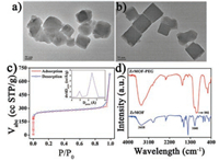 | Fig. 1. TEM of ZrMOF NCs obtained in different reaction time: (a) 8 h and (b) 10 h with PVP. (c) N2 isothermal adsorption-desorption and the micropore size distribution curves (inset) of ZrMOF NCs. (d) FTIR spectra of ZrMOF NCs and ZrMOF-PEG NCs dispersed in water, respectively. | |