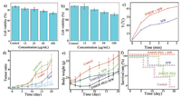 | Fig. 2. (a) MW heating curves of water, 0.9% NaCl solution, ZrMOF NCs dispersed in water and 0.9% NaCl solution. (b) The temperature changes of ZrMOF NCs dispersed in water and 0.9% NaCl solution. (c) MW conversion efficiencies of ZrMOF NCs dispersed in water and 0.9% NaCl solution. (d) Heating and cooling curves of ZrMOF NCs dispersed in DMEM under MW irradiation. (e) The linear fitting of cooling curve for ZrMOF NCs. | |