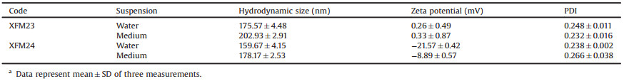 Table 1 The average hydrodynamic size, Zeta potential and PDI of XFM23 (h-MWCNTs) and XFM24 (c-MWCNTs) in water and medium.a |