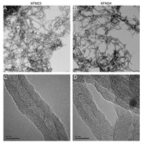 | Fig. 1. The TEM images of XFM23 (h-MWCNTs) (A, C) and XFM24 (c-MWCNTs) (B, D). | |