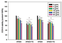 | Fig. 2. The cellular viability of HUVECs. HUVECs were pre-incubated with or without 500 nmol/L TG for 1 h, and then exposed to various concentrations of XFM23 (h-MWCNTs) and XFM24 (c-MWCNTs) for 24 h. The cellular viability was measured by CCK-8 assay. Data represent mean ± SEM of three independent experiments (n = 3 for each). * P < 0.01, compared with control, ANOVA. | |