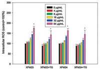 | Fig. 5. The increase of intracellular ROS in HUVECs. HUVECs were pre-incubated with or without 500 nmol/L TG for 1 h, and then exposed to various concentrations of XFM23 (h-MWCNTs) and XFM24 (c-MWCNTs) for 24 h. The intracellular ROS was determined by using a fluorescent probe DCFH-DA. Data represent mean ± SEM of three independent experiments (n = 3 for each). * P < 0.05, compared with control, ANOVA. | |