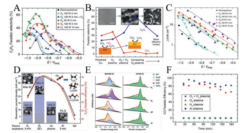 Min's group studied the structure effect on the catalyst by preparing Au islands using O2 plasma treatment on an Au foil [30]. They found the Faradaic efficiency, product formation rate, and onset potentials for CO2RR were all improved by the expanded surface areas compared with the untreated Au foils. Later, Cuenya's group have demonstrated that the structure effect plays only a partial role in improving catalytic performance [51]. They prepared a series of copper-based catalysts by O2 and H2 plasma treatment, respectively. Compared with the fresh Cu foils, all plasma-treated samples had higher surface roughness while only these oxidized ones showed lower onset potentials and higher selectivity for ethylene (60%), indicating the roughness had a partial effect on improving its catalytic activity while the oxidized copper species played a crucial role in lowering the onset potential and increasing ethylene selectivity (Figs. 3A-C). The group also reported a lowpressure plasma pre-treatment on Cu nanocubes could tune Cu (100) facet and oxygen/chlorine ion content, resulting in highly active and selective Cu nanocube electrocatalysts [52]. Compared with electropolished Cu foil, plasma-assisted prepared Cu nanocubes had relatively low overpotential and higher hydrocarbon selectivity (with the Faraday Efficiency of 22% for ethanol, 45% for ethylene, and 73% for all C2 and C3 compounds) (Figs. 3D-E). After O2 plasma treatment, it can be seen that the sample with dominant Cu2+ component due to heavily oxidation, while the Auger spectra of the other samples are dominated by Cu+ species (Fig. 3E). The characterization and electrochemical measurements revealed that the activity of these electrocatalysts could be improved by tuning microstructure, ion content, defect concentration, and surface roughness. Meanwhile, the group synthesized oxidized and defective Ag electrocatalysts for CO2RR by a plasma oxidation pre-treatment [53]. The plasma treatment can increase the specific surface area of the Ag foils and enhance the number of low-coordinated active sites, which lowers the overpotential and improves the performance of the CO2 electroreduction. DFT calculation also showed that the highly defective surface of Ag foils with the presence of local electric fields can decrease the overpotential of CO2RR.