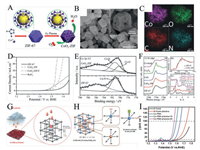 | Fig. 8. (A) Schematic of the preparation of CoOx-ZIF; (B) SEM images of CoOx-ZIF; (C) Element mapping of Co, O, C, and N in CoOx-ZIF; (D) LSV curves for OER of all samples; (E) Co 2p3/2 XPS peaks of ZIF-67 and CoOx-ZIF; (F) XANES and EXAFS spectra of CoOx-ZIF and ZIF-67. Reproduced with permission [99]. Copyright 2017, Wiley-VCH. (G) Preparation schematic of Co-PBA; (H) The structure of Co-PBA with composition Co3(Fe(CN)6)2; (I) LSV curves for OER of pristine and plasma-treated Co-PBA samples. Reproduced with permission [100]. Copyright 2018, Wiley-VCH. | |