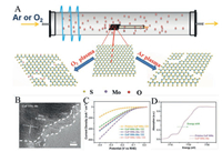 | Fig. 9. (A) Illustration of the preparation of plasma treatment of MoS2 thin films. Reproduced with permission [105]. Copyright 2015, The Royal Society of Chemistry. (B) The HRTEM images of CoP nanowires with 40 s of oxygen plasma etching; (C) LSV curves of CoP NWs/CC with different oxygen plasma engraving time; (D) XANES spectra of CoP nanowires and CoP NWs 40 s. Reproduced with permission [106]. Copyright 2018, Wiley-VCH. | |