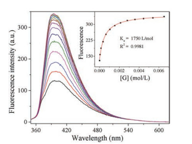 | Fig. 5. Fluorescence spectra of 1a (5.0 × 10-6 mol/L) when titrated with urethane in deionized H2O at 25 ℃. Inset: curve fit of the titration data according to a 1:1 binding stoichiometry. | |