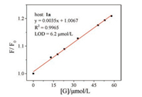 Molecular tubes 1a and 1b show fluorescent enhancement in the presence of urethane. Therefore, they can be used as fluorescent sensors for urethane in water. The limit of detection (LOD, 3δ/slope) and the upper concentration limit were then determined: for 1a, 6.2 – 60 μmol/L; while for 1b, 29.8 – 35 μmol/L (Fig. 7 and Fig. S14 in Supporting information). Obviously, 1a has a wider applicable concentration range for the detection of urethane in water. This limit of detection can meet the requirements for the control of urethane in some distilled wines (such as Brazilian sugar cane spirits, Stone fruit spirits, etc.) and beers [15]. In addition, ethanol would not interfere with the detection of urethane in the alcoholic drinks, because 1a binds very weakly to ethanol (9 L/mol) and shows no obvious fluorescent response [27]. Furthermore, fluorescent sensing of urethane in beer (Tsingtao Beer) by 1a was performed. The intrinsic fluorescence of 1a was quenched to some extent. Nevertheless, fluorescent enhancement was still observed with the addition of urethane. Consequently, 1a can work as a fluorescent sensor to urethane even in beer (Figs. S15 and S16 in Supporting information). The limit of detection (LOD, 3δ/slope) and the upper concentration limit are 22.9 μmol/L and 60 μmol/L, respectively. As for other alcoholic drinks and fermented food products, urethane can be detected after concentrating the samples with extraction.
