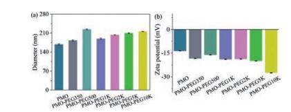 The stability of PMO-PEG was investigated in PBS and DMEM. The unmodified PMOs, PMO-PEG350, PMO-PEG500, PMO-PEG1k, PMO-PEG2k, PMO-PEG5k, and PMO-PEG10k were dispersed in PBS or DMEM, respectively. The hydrodynamic diameters and polydispersity index (PDI) of the nanoparticles were measured and recorded at different time points at 37 ℃.