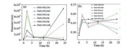 | Fig. 6. The changes of hydrodynamic diameters and PDI of the PMO-PEGs with time in DMEM. | |