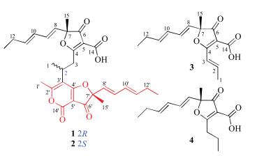 Comparison of NMR data with those of the known nivefuranone A (3) [21] revealed that pafuranone A (1) contains a similar furanone core and a (1E, 3E)-hexa-1, 3-diene moiety, which could be confirmed by the COSY correlations of H-8/H-9/H-10/H-11/H2-12/H3-13 (Figs. S6 and S7) and the key HMBC correlations of H-9 to C-7, H-8 to C-6/C-15, and H-15 to C-6 (Fig. 2, Figs. S8–S13 in Supporting information). Furthermore, another similar moiety containing a 4H-furo[3, 2-c]pyran-3, 4(2H)-dione dicyclo skeleton could be deduced by the COSY and HMBC correlations (Fig. 2). All these data let us speculate that compound 1 may be a dimer derived from nivefuranone A (3) or its analogue. Two monomeric units were connected through a C-2–C-3 sigma bond, which could be confirmed by the COSY correlations of H3-1/H-2/H2-3 and the HMBC correlations of H-3 to C-5/C-3', H-2 to C-2'/C-4' and H-1/H3-1' to C-3' (Fig. 2, Figs. S6–S13). Considering the 14 degrees of unsaturation and one remaining non-protonated carbon (δC 155.5), a 2-pyrone unit was further confirmed.