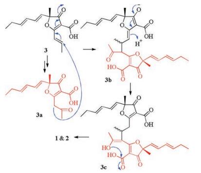 In order to further figure out the configurations of C-7 and C-7', a plausible biosynthetic pathway for pafuranones A (1) and B (2) was postulated (Scheme 1). Both of them might be derived from the same precursor, nivefuranone A (3). Compound 3 undergoes hydrolysis and oxidation to form the intermediate 3a, which further undergoes 1, 6-addition with one molecule of 3 to form the intermediate 3b. By a keto-enol tautomerism, intermediate 3b was then transformed to the intermediate 3c that undergoes a lactonization to generate the 2-pyrone ring. Because this 1, 6-addition lacks stereoselectivity, two epimers (1 and 2) were produced. And all the reactions do not deal with the chiral centre of the monomer (3). Thus, the absolute configurations at C-7 and C-7' of compounds 1 and 2 were deduced the same as compound 3 from the biosynthetic pathway.
