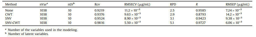 Table 1 Statistics for the calibration and validation performance of PLS models. |