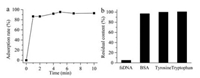 | Fig. 2. (a) Effect of adsorption time on the adsorption rate. (b) The percentage of the residual content of fsDNA, BSA, tyrosine and tryptophan in the solution after adsorption. | |