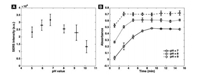 | Fig. 1. (A) SERS intensity (1.0 × 10-7 mol/L R6 G) of the silver colloid synthesized under different pH values; (B) The relationship between maximum absorbance values of different pH values with reaction time. | |
