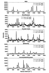 | Fig. 4. The SERS spectra of several harmful substances (line: high concentration; dotted line: the lowest detection concentration). | |