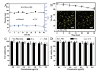 | Fig. 1. (A) TEM image of SCA NPs. Scale bar in TEM image: 500 nm. (B) DLS intensity-weighted diameter of SCA NPs. (C) Absorbance spectra and (D) PL (excited at 450 nm) spectra of AIE dyes and SCA NPs. Insets: Photographs of AIE dyes in THF, and SCA NPs in water under UV light (365 nm), respectively. | |