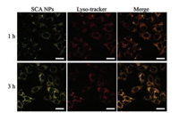 | Fig. 3. CLSM images showing changes in the signal of SCA NPs in HeLa cells treated with SCA NPs with the same concentration for 1h (upper), and 3h (lower) at 37 ℃. Lyso-tracker red was used to stain endosome. Scale bars: 20 μm. | |