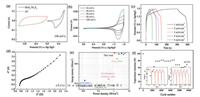 | Fig. 4. Electrochemical performance in two-electrode system: (a) CV curves of MoS2/Ni3S2 and AC electrodes at 100 mV/s; (b) CV curves at different scan rates; (c) GCD curves at different current densities; (d) Nyquist plots; (e) Ragone plot; (f) cycling performance at a current density of 8 mA/cm2. | |