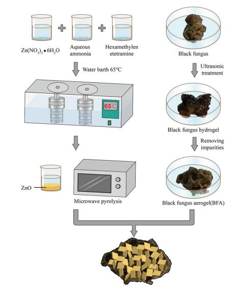 | Fig. 1. Schematic of the fabrication process of black fungus aerogel (BFA) and BFA/ ZnO. | |