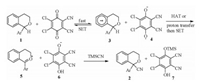 Based on the existing mechanistic studies on DDQ-promoted ether oxidation, a mechanism for the C—H cyanation of secondary benzylic ethers was proposed (Scheme 4) [12]. α-Monosubstituted isochroman 1 underwent an initial single electron transfer (SET) to DDQ gave the radical cation 3 together with the DDQ radical anion 4. The radical cation 3 can either undergo a hydrogen atom transfer (HAT) to 4 or a proton abstraction by 4 followed by another SET providing 1, 1-disubstituted oxocarbenium intermediate 5. A nucleophilic attack of TMSCN on to 5 yielded the expected tertiary ether 2.