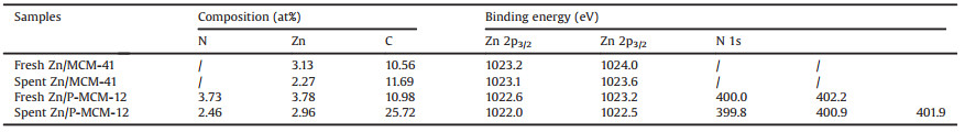 Lastly, in order to measure the chemical state and surface composition of the representative Zn/P-MCM-12 catalyst, the XPS experiment was performed. From Fig. S6 (Supporting information), the obvious peak at the binding energy of 400.0 eV indicated that the presence of the nitrogen (N 1s) of the Zn/P-MCM-12 catalyst [41], which confirmed that the PEI has been doped into the MCM-41 framework due to the N atoms derived from the PEI. More importantly, the N 1s peak (Fig. 9A) has been fitted well by two peaks with the binding energies of 400.0 eV and 402.2 eV (Table 1) for the fresh Zn/P-MCM-12 catalyst. Some studies have been pointed out that the N 1s peak at higher binding energy (400-402 eV) could be related to the adsorption of metal ions (Mn+) [42-44], which would cause to the positive polarization. Therefore, in this study, the N 1s peak at low binding energy could be attributed to the N of the amino group, the other N 1s peak would originate from the charged ammonium, such as -NH3+ or -NH2…M2+ [45, 46]. However, after the reaction, the N 1s consisted of three peaks and the binding energies slight reduced indicated that the metal-support interaction appeared during the reaction. It is well known that the N atom derived from the amino group has a free electric pair, which could be formed the coordination bonds with the metal ions and resulted to the increase of metal electron density to obtain more active sites. This can be further confirmed by the Zn 2p3/2 XPS spectra for the Zn/P-MCM-12 catalyst (Fig. 9B). As shown in Table 1, the binding energies of Zn 2p3/2 peaks in Zn/P-MCM-12 catalyst is lower than that of Zn/MCM-41 catalyst, indicating that the Zn species obtained the electrons from the PEI modified support caused to the lower Zn 2p3/2 binding energies. These could imply that the stronger interaction between Zn2+ and amino group from the PEI modified support, as well as for the spent Zn/P-MCM-12 catalyst. In addition, the elemental compositions in Table 1 indicated the addition of PEI could enrich more Zn species and present the Zn species loss (Zn loss of 13.8% is obvious lower than that of Zn/MCM-41 catalyst). Therefore, the stronger metalsupport interaction, more active sites and lower Zn loss would be also responsible for the high catalytic performance in the hydration of acetylene.