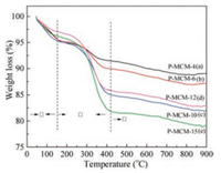 The thermal stabilities of P-MCM-x samples were performed by the TG experiments, and the results are plotted in Fig. 2. Firstly, as shown in Fig. 2, the first step of weight loss below 200 ℃ could be attributed to the removal of moisture molecules and/or desorption of organic molecules on the surface of P-MCM-x samples. Then, the middle of weight loss at the temperature range of 200-400 ℃ would be related to the decomposition of amine groups anchored to the framework. Moreover, the last step of slight weight loss might be belonged to the release of surfactant molecules in the samples. Meanwhile, the corresponding DTG curves were observed two obvious peaks at 50-150 ℃ and 300-400 ℃ in the Fig. S1 in Supporting information. The first peak could be due to the adsorb water or/and organic molecules loss; the second peak would be caused by the decomposition of amine groups.