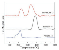 To explore the influence of PEI modification on the Zn catalyst, the following experiments were conducted. Firstly, the H2-TPR was used to reveal the strength of interaction between the metal and support and the reducibility of metal catalysts and the results are shown in Fig. 6. It is clearly found that a reduction peak at temperature of around 380 ℃ for the Zn/MCM-41 catalyst. For the representative Zn/P-MCM-12 catalyst, there are two obvious reduction peaks at the temperature of 337 ℃ and 475 ℃, except for the reduction peak of P-MCM-12 material. It might be speculated that the low temperature of reduction peak could be attributed to the reduction of zinc species dispersed on the support external surface, and the other reduction peak might be belonged to the reduction of the zinc species that entered into the inside pore channels with strong interaction between the P-MCM-12 support. These obvious changes could suggest that the metal-support interaction has been strengthened after the incorporation of PEI, which may be one of the reasons for the high activity of Zn/P-MCM-x catalysts in the acetylene hydration reaction.