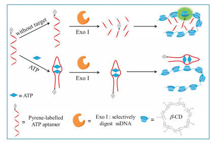 To investigate the feasibility of our proposed method, the fluorescence emission of the system with 0 or 10 mmol/L ATP respectively was detected (Fig. 2). When ATP was absent, the fluorescence intensity of the system was high. When ATP was introduced, it bound to the 3'-pyrene-labelled aptamer and hindered the digestion of the aptamer. The steric hindrance of ATP-aptamer hairpin complex inhibited the host-gest interaction of pyrene and polyβ-CD, so the fluorescence intensity kept weak. These results confirmed the feasibility of our proposed strategy.