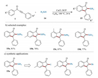 Recently, a copper-catalyzed protocol to access silyl-functionalized 1-indenones with commercially available silanes as radical precursors was disclosed by Zhu et al. (Scheme 7a) [66]. This method represents an efficient route to access a wide range of silylated 1-indenones in moderate to high yields with broad scope, excellent selectivity as well as gram scale-up ability (Scheme 7b). Notably, these silylated 1-indenones can act as versatile building blocks for valuable organic transformations (Scheme 7c). The KIE studies revealed that generation of silyl radical by the cleavage of Si-H bond would be the rate-determining step in this transformation.