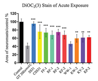 | Fig. 1. The protective effects(Acute Exposure)of peptide at concentration of 50 μg/mL on hair cell damage, induced by gentamicin, with menbrane potential dye DiOC2(3). (Data were analyzed by one way ANOVA using SPSS, **P < 0.01, ***P < 0.001). | |