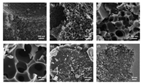 Figs. 2a-e show scanning electron microscopy (SEM) images of HPCs synthesized by varying the mass ratio of PAM and R/F resin and CR/F-PAM synthesized without KOH activation. All the R/F-PAM IPNs-derived HPCs present honeycomb-like structure with large amounts of open macropores. With the increasing PAM/RF mass ratio from 0.25 to 0.5, the diameter of macropores in resultant HPCs increases from 120 nm to 250 nm and plenty of mesopores can be observed on the rough macropore walls (Figs. 2a-b). Further increasing PAM in IPNs results in continuous increase in macropore diameter to 1.2 μm (Figs. 2c-d). The increase in porogen level leads to skeleton collapse and residual fragments on the surface of HPCs, and no mesopores are observed on the smooth pore walls. In addition, the absence of KOH also causes the missing of macropores in stone-like CRF-PAM, which is assigned to the limited pore generation effect merely from the decomposition of PAM (Fig. 2e). Transmission electron microscopy (TEM) image of HPC-0.5 (Fig. 2f) shows an interconnected mesopores network with the diameter ranging from 2 - 10 nm all over the carbon walls, which is in accordance with SEM result.